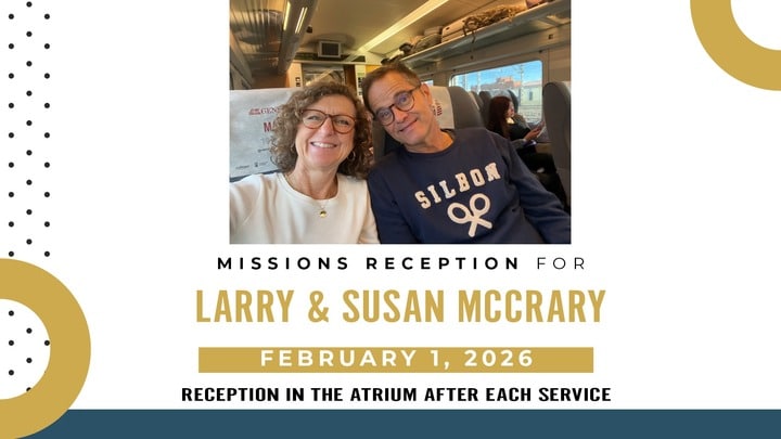 Join us in the Atrium on February 1 after each service to connect with Larry & Susan McCrary. This missions reception is a chance to hear about their lives and work as long-term missionaries sent from Sojourn East and serving overseas. Stop by for snacks, meaningful conversation, and an opportunity to help us warmly welcome…
