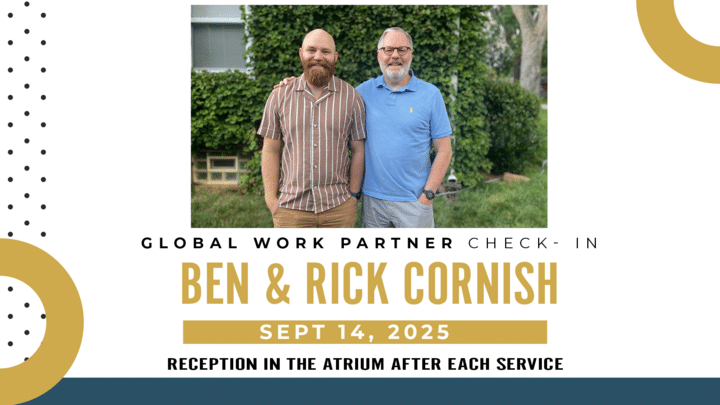 Join us in the Atrium on September 14th to chat with Ben and Rick Cornish and hear about their ministry and work. They are Global Work Partners who serve the Lord…